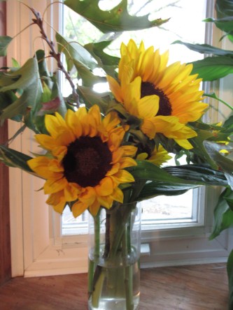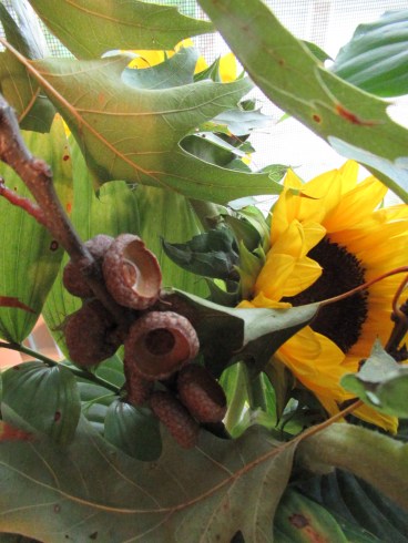 The sunflowers were from a local grocery store and greens picked from my mom’s yard and on a walk in the neighborhood. The weather in the Midwest is unnaturally warm, even the evenings. It’s a very strange combination of waning autumn light and early September temperatures. The flowers are fortunately seasonal at least.