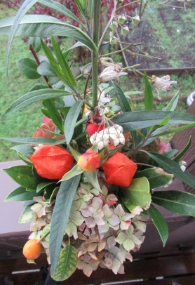 The finished product contains the “fruits” of the garden, the fruits of harvest. I’m grateful there’s enough still available that I can put together an appropriate table arrangement.