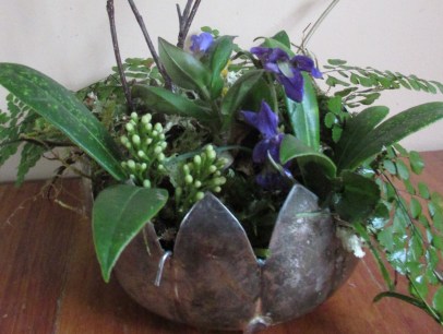 While plants may be emerging (I see a few blooming daffodils this week! oh my) most of what is available in the garden is still in miniature…. hellebores, violets, and pulmenaria, along with delicate blooming branches. These can be put together to make a still life which is what I did this week in a silver container thrifted at Goodwill.