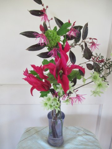 The garden is awash with color. Tulips, clematis, Chinese fringeflower, snowball viburnum. Simple purple glass vase.