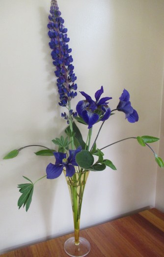 Lupine, iris, and clematis in a champagne flute