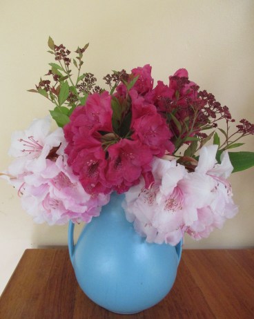Nothing easier than a vase full of rhodies and a bit of spirea. The Pacific NW is rhodie country and our garden has five mature specimens.