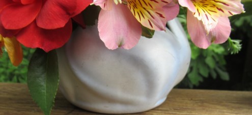 The vase is extra special too with a lovely blue color and embossed looking swirls. It’s vintage art pottery.