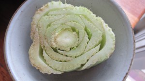 This example is more of a contrast. But if you look closely at the blossoms on this unusual camellia and you’ll see a little smatter of off-white, like the pot.