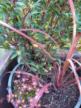with its green, turquoise and reddish scheme led to my choice of these plants, where the reds echoed each other and the color of the pot. The reds themselves are an example of color harmony.